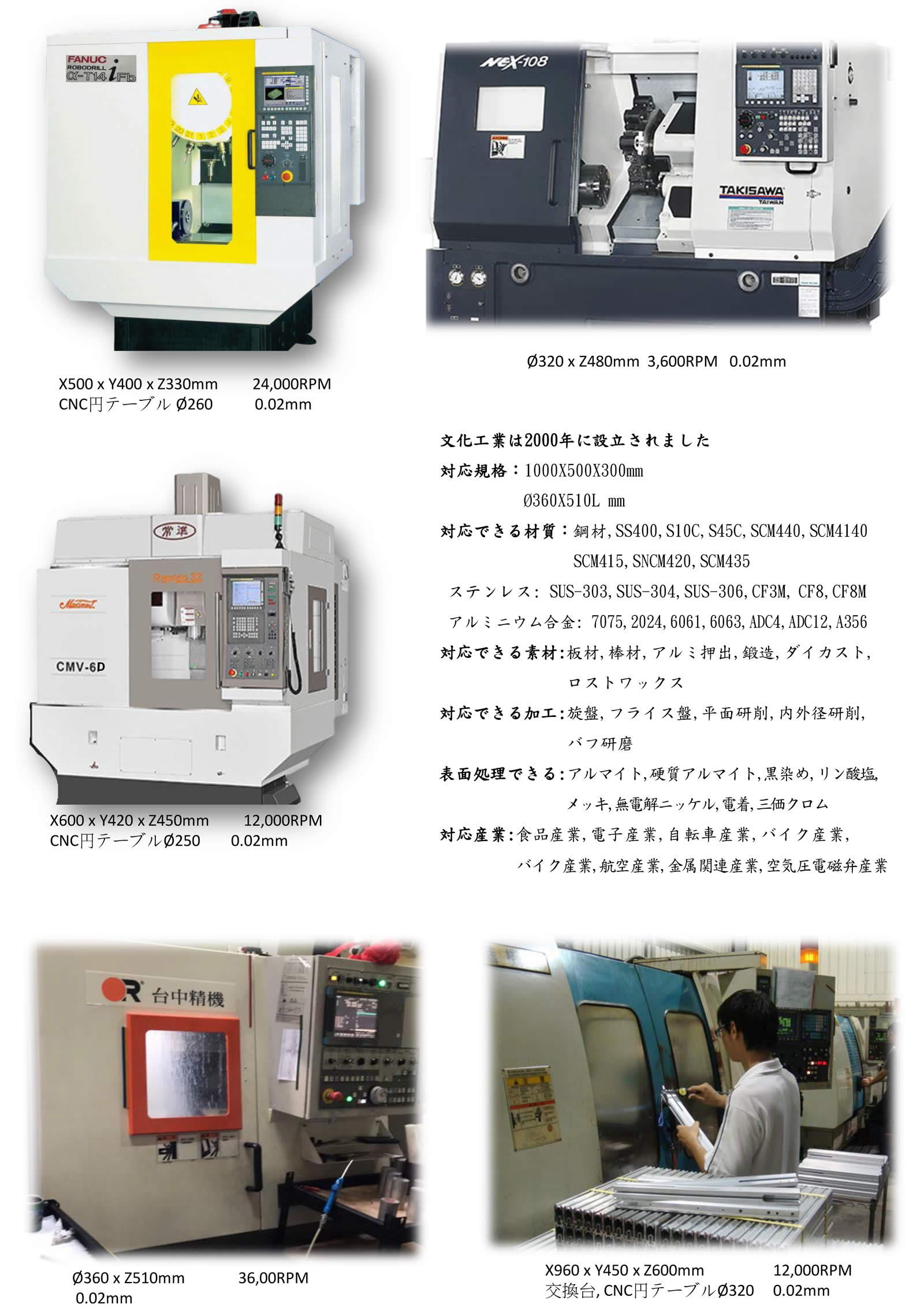 弊社は台湾最大な機械加工業集落である中部に位置し、精密部品・アルミ・スチール・ステンレス・アルマイト処理・黒染め、メッキ加工を営んでおります。